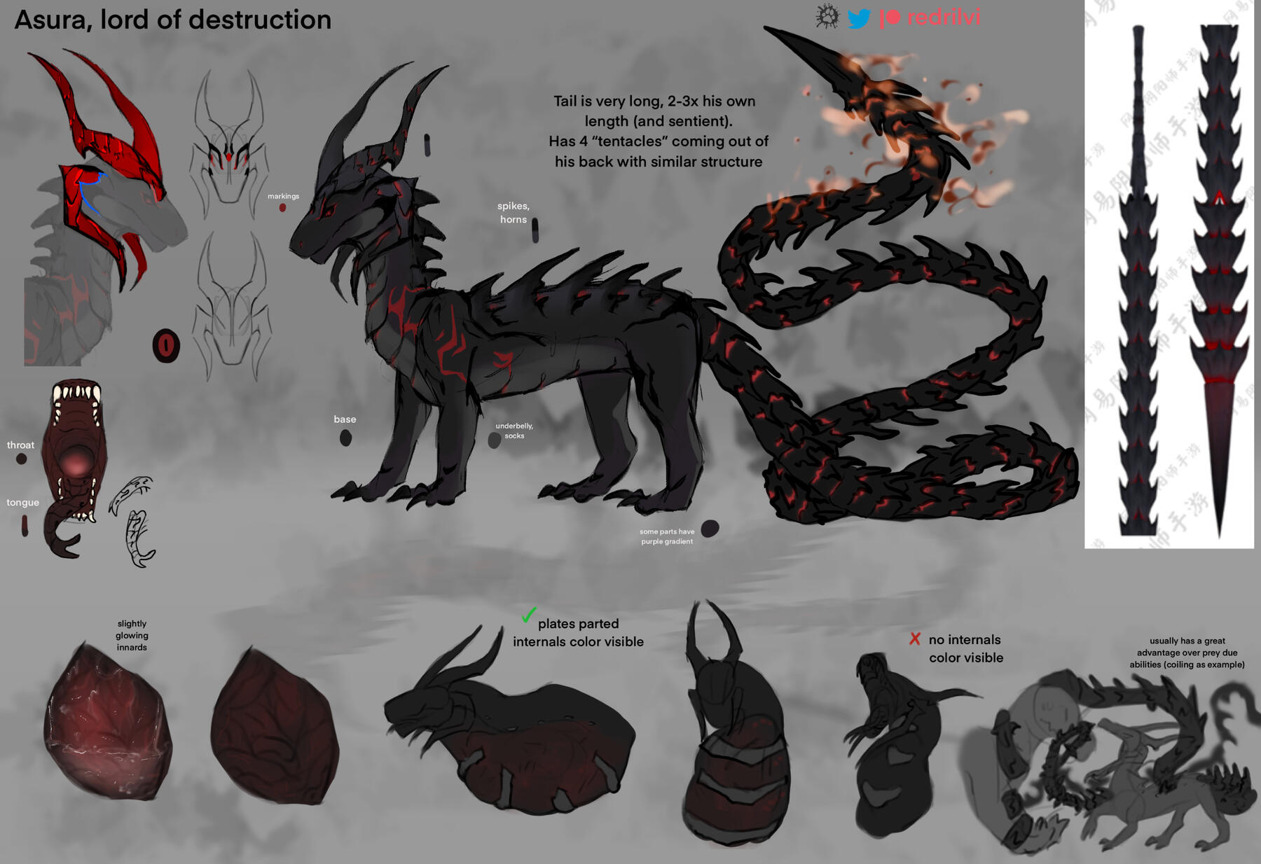 However, he is not a blood-thirsty beast all the time as a special ones can catch his softer side. Asura appears as harsh and impulsive individual, an façade he need to maintain, but in reality he is just another monster who can love and care.While Asura seems impulsive and ruthless enough on his own, his spiritual entity posses a separate consciousness. It affects its master a lot, a bloodthirsty mist sent regardless of Asura's preferences. That's why he choose solitude - to avoid unnecessary victims. (Cat simping this tail a lot and gave it a nickname)Away from his "Abyss lord responsibilities" he cares a lot about common people (himself had a humble origin), he often works as a mercenary and occasionally saves lone settlements from monsters according to the sense of justice. Asura likes traveling, but always returns to his partner's little house.Vore-related information: