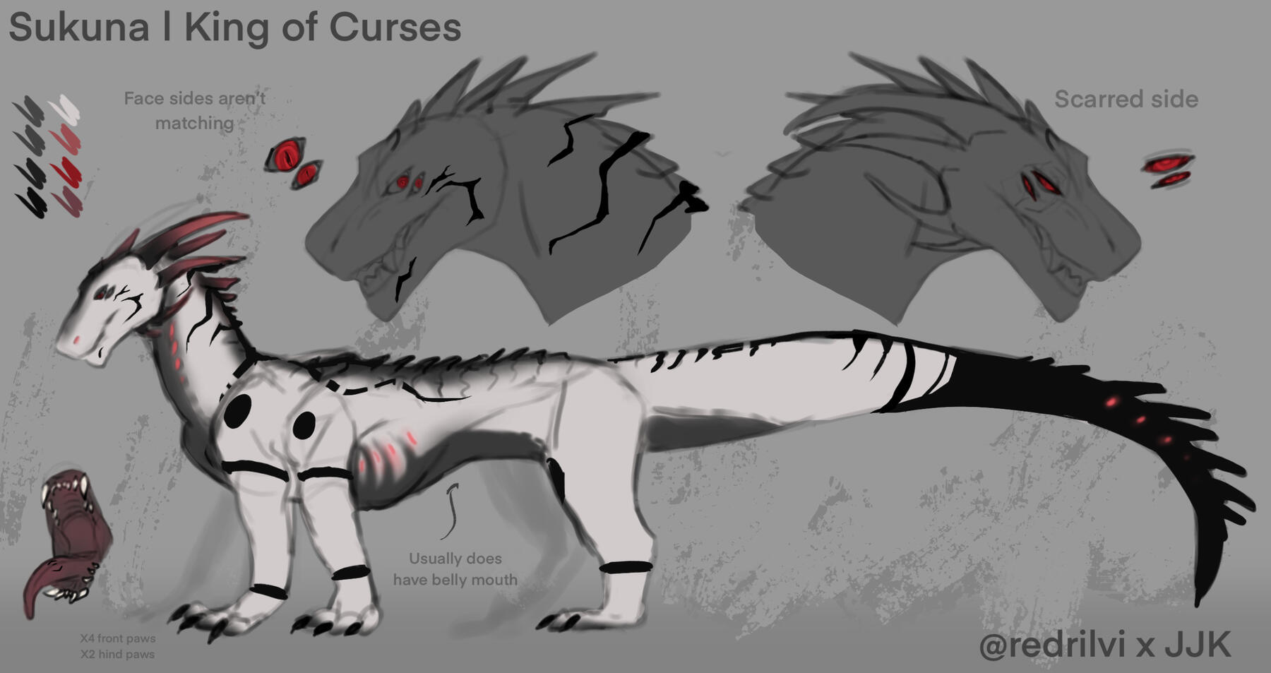 Curse (shapeshifter - demi-human, drake, anthropomorph)Sukuna is cold-hearted and sadistic individual when it comes to treating anyone around him (prey included). However it’s very hard to sparkle an interest within him to make treat you as something worthy. Sukuna tends to toy with his opponents, proclaiming superiority over them. There no specific approach to the king of curses, who acts on a whim and follows his own desires to achieve satisfaction.He doesn't have any specific preferences when it comes to prey, just make sure to show all you got and struggle more.. May be he will find it funny. Sukuna is hard to entertain (equally as his belly), he obliterates any life as a mere sustenance for his body and a source of entertainment to pass time. He probably doesn't follow any goal in life, just trying to kill some time from day to day... and sleeping off meals is a good way to put it.Vore-related information: