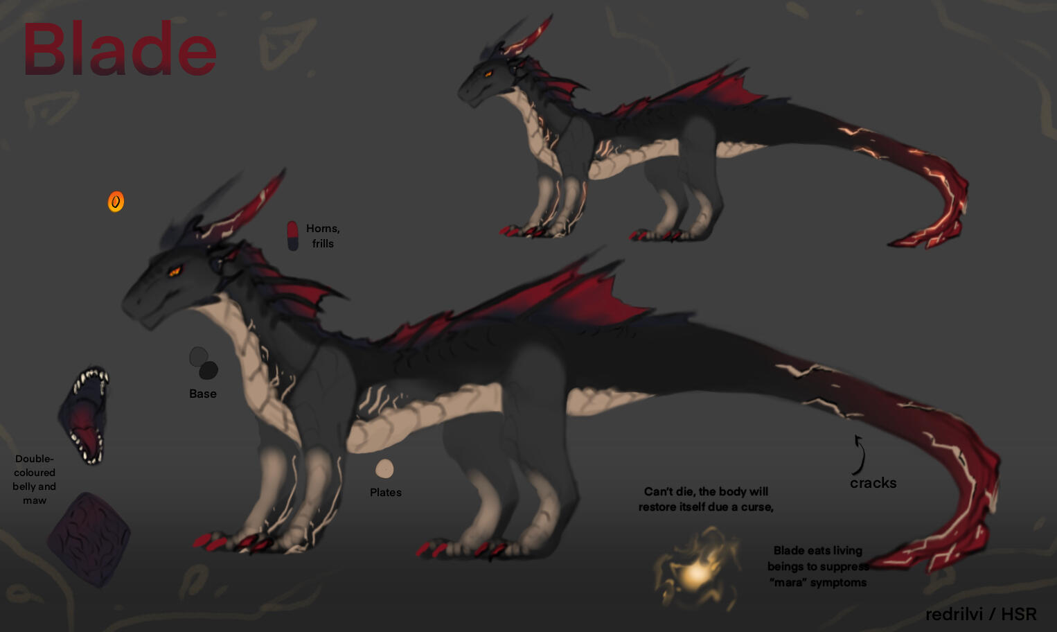 * Belly’s destructive capacity (what it can digest): any organic matter (bones also when given time).* Digestion speed: around few hours for samesize prey to several days/week for anything larger.* Volume (what prey can it hold): any prey up x5 his size. While it can hold considerably larger prey, Blade simply doesn't pay it much attention and saves time, giving a preference to more sizeable meals.* Belly efficiency (how the nutrients are used): a lot of energy (both nutrients and life essence) is used to suppress the curse's symptoms. The rest is used to nurture his body and use excessive supply as fat.* Special quirks: while his belly doesn't posses any special powers, besides efficient digestion, sometimes Blade wonders if his prey won't return - or would they suffer the same fate if eternal life like him.Consuming life essence in such brutal way helps him to deal with curse symptoms, maintaining mental stability (otherwise he might lose control). Does he feel any sorrow towards it? Little is known about it, but for sure Blade treats it as something that simply needs to get done. Any other methods proves itself to be less.. effective and less prolonged.