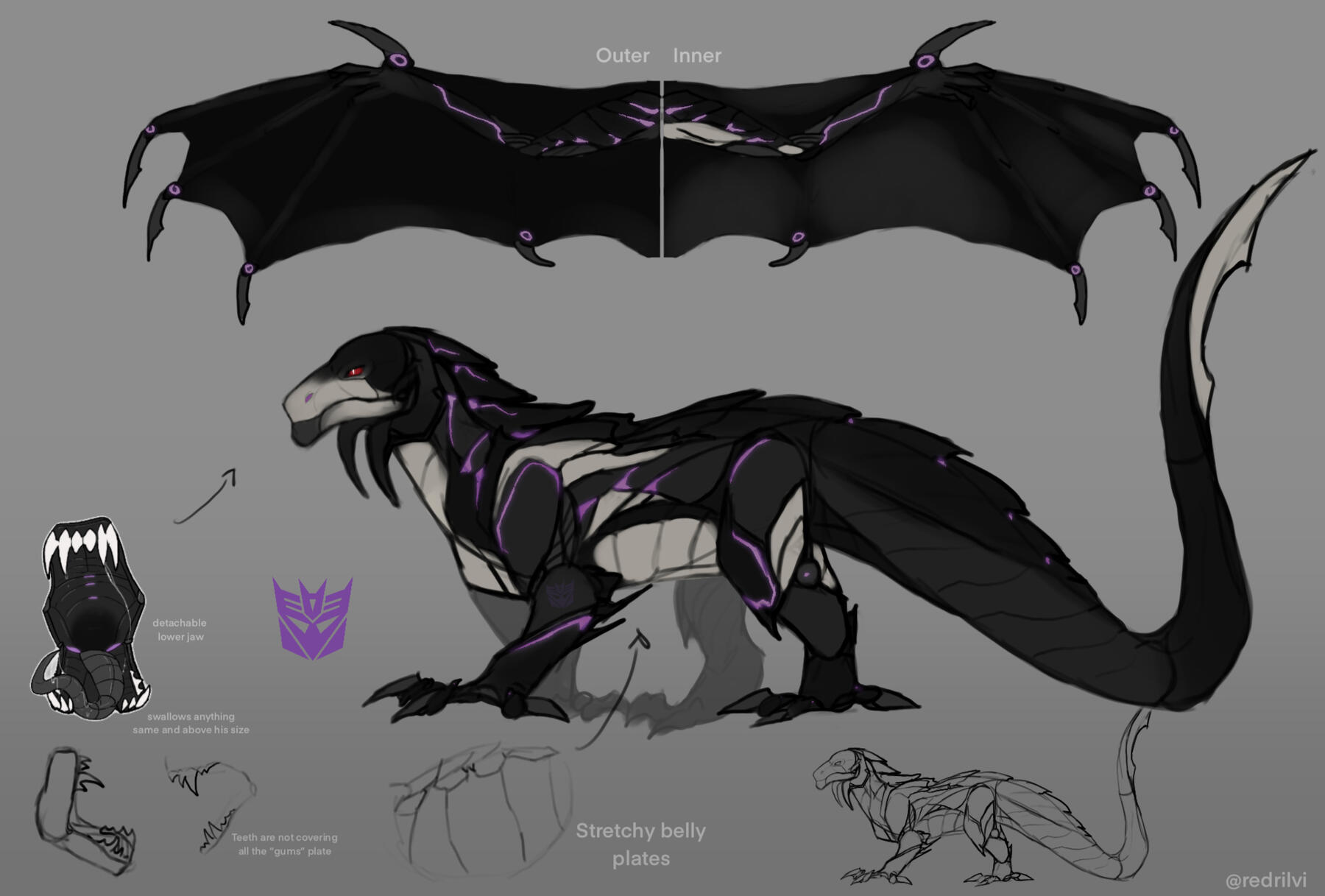 * Belly’s destructive capacity (what it can digest): Detection system checks prey's components and initialize acids with suitable potency (there's no "turn off" button).* Digestion speed: from a few minutes to several hours/days.* Volume (what prey can it hold): his skin is modified especially to hold big volumes inside, however possible upper limits is unknown yet. [Shockwave is researching this matter]* Belly efficiency (how the nutrients are used): excessive nutrients are stored in energon trails (inflating it as well), resembling so-called "fat" to use as fuel later. Some stored into his reproductive module as well* Special quirks: Diodes in his maw travels down his gullet, some of them nested between belly walls . It does change color depending on assimilation progress (from red to violet and vice-versa).As pretty big predacon he need a lot of fuel (~250t of meat/60 energon cubes), that is really hard to do; he preys upon larger organic creatures/bots to fill the gauge to its maximum.