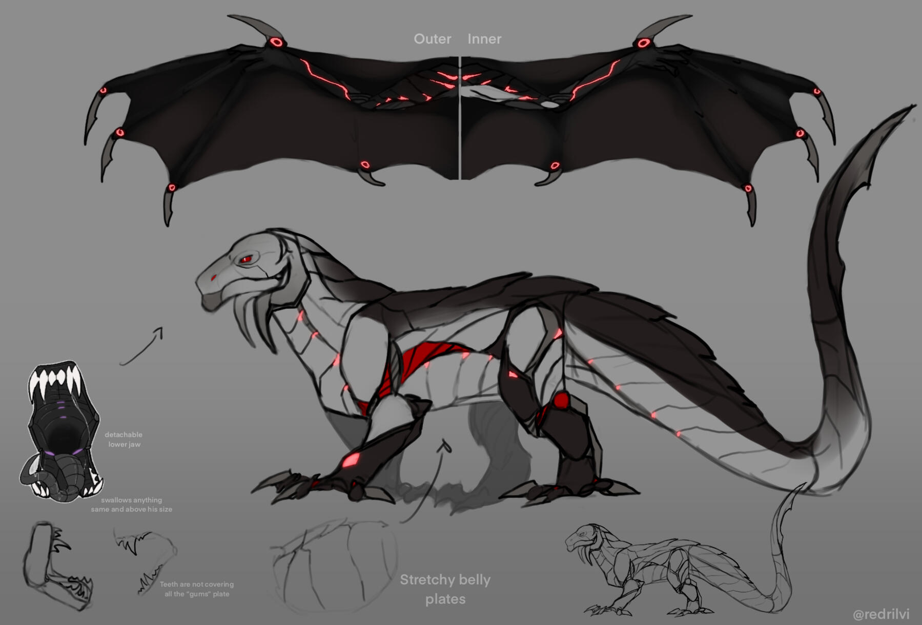 Looking for a more evident presentation? Raiden have a story featuring him: Side-tracked Operation part 1, part 2* Belly’s destructive capacity (what it can digest): enhanced acids can destroy both organic matter and synthetic, metal and bones alike.* Digestion speed: regulated, varies from hour to several days/week.* Volume (what prey can it hold): his belly's material is quite stretchy and resistant, able to hold prey almost x10 his size. However due some feeding habits Raiden rarely indulges that much.* Belly efficiency (how the nutrients are used): most are converted into fuel. Raiden does have a synthetic body and only a small amount of nutrients actually ends up as a fat.* Special quirks: